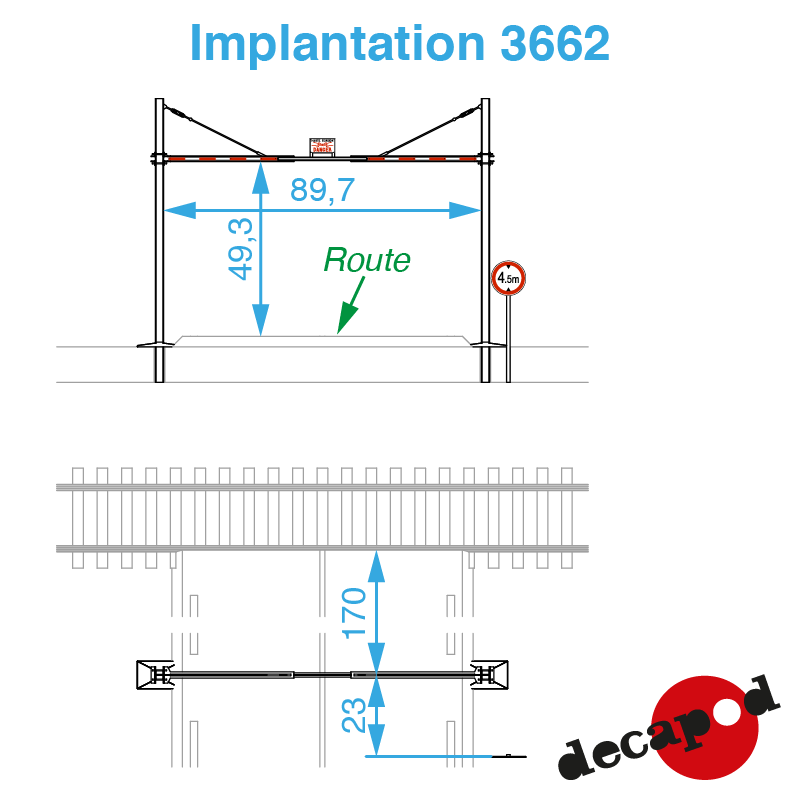 Notre kit permet de réaliser 2 portiques accompagnés de 2 panneaux routiers, de manière à équiper un passage à niveau de part et d'autre.